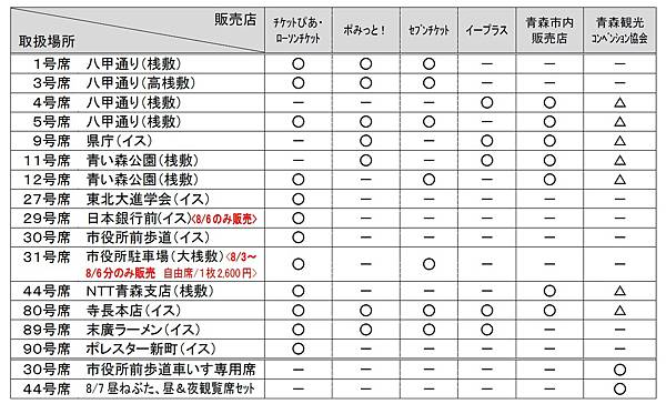 個人票預定的17區票務,由6個售票點販售:1.LAWSON售票機 (チケット ローソン)、2.Pomit售票系統 (ポみっと)、3.7-11訂票系統(セブンチケっト)、4.e+、Family便利商店售票系統(イープラス)、5.青森市內販售店、6.青森觀光協會。並不是6個售票點都有賣所有17個座位區的座位,而是6個售票點分配不同的座位區;6處售票點的分配請看下表,各座位所在請對照下方遊行路線及座位分布圖。
