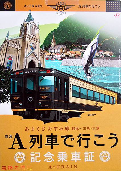 凡旅遊者,總愛有個標誌讓自己拍照,表示到此一遊;日本許多旅遊列車常會準備著一套有該列車標誌再附上日期,讓旅客可以舉著它拍照;A-TRAIN也不例外,搭一趟A列車千萬別忘了舉牌拍照,讓記憶可以留存著:列車、教堂、海豚的日本天草印象。