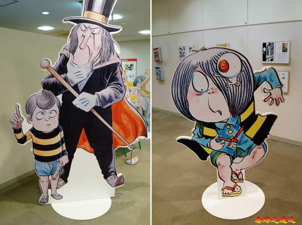 上到二樓即會進入「水木茂 漫畫世界(水木しげる 漫画ワールド)」的展示廳,頗為寬廣的大廳擺了好多座人形立牌,許多遊客都一一的上前合照,最有人氣的當然是鬼太郎人形立牌。如果對人形立牌的人物不熟悉,可以在立牌後方找到相關的說明。