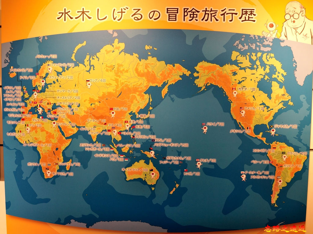 展示廳往內為水木茂的世界之旅,水木茂酷愛旅行,在旅行途中收集各國的妖怪故事與各種古老與妖怪傳說有關的物品,由水木茂冒險旅程的地圖可以看出他到過世界許多國家,台灣曾經到訪5次,算是世界諸國中到訪比較多次的地方,其中巴布亞新幾內亞(バフア二ュ―ギ二ア)曾經到過15次,水木茂先生在1943年2次世界大戰時被派至布亞新幾內亞駐軍,1944年聯軍空襲時被炸掉左手腕;之後水木茂的漫畫曾經參戰的慘痛經驗,畫下「全員玉碎!(総員玉砕せよ!)」的漫畫,以控訴的角度,畫出當時日本「只許戰死不准生還」極端「玉碎」愛國主義,不知是否因為這個緣故,之後多次到此地巡遊。