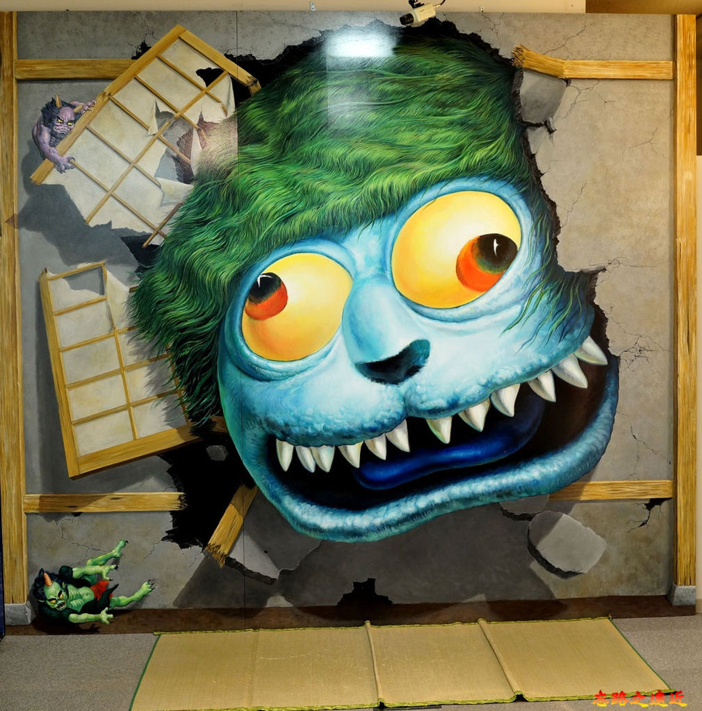 隧道的終端的黑牆上,貼著幾具妖怪的圖像。最下端有3個小小的開口;這3個小洞口往內看,可以見到妖怪們隱藏在空間各處,請找找看一共有幾隻妖怪,由於小開口在下方,在走過時很容易錯過。