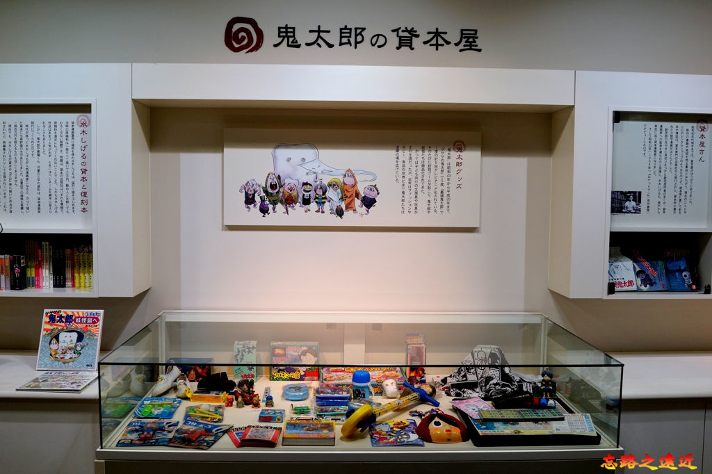 除了四處擺放的人形立牌及鬼太郎主角們的秘密說明牌之外,各牆面上依照水木茂漫畫創作的年代,展示了所有的漫畫主題及樣本。雖然水木茂是日本妖怪漫畫的第一人,但是,他也畫了不少的戰爭漫畫及幻想漫畫,據說是因為當時水木茂極窮 (據說當時日本稅務局的人都不相信會有人窮到這種地步),所以必須不斷的創作來餬口。