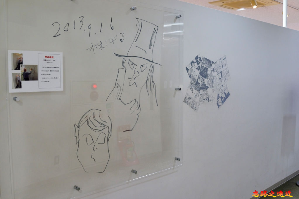 「妖怪廣場」後方連接往一樓的長廊,長廊上的牆上展示水木茂先生的「人生繪卷」,這是水木茂先生由1922年3月8日出生(Look2up寫本篇文章的日期),到80歲將一生的重要經歷以詼諧的筆調,一鏡到底的方式呈現出來。