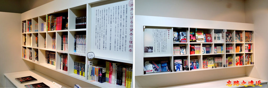 在攝影區的旁邊展示水木茂先生所出版過的漫畫,包括復刻版以及貸本。所謂「貸本」是指當時編印目的就是出版後是為了讓讀者租借閱讀;在過去,無論是日本或是台灣,並不是每一個人都有錢買漫畫書,所以漫畫出租店(貸本屋)便極為盛行,現在已經很少見到漫畫出租店了。