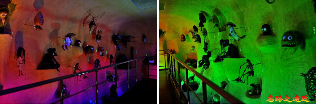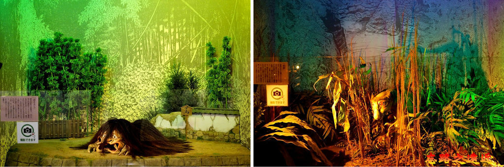 ↑ 「妖怪洞窟」展示了43隻妖怪,綠色和紅色燈光,營造神秘的氣氛