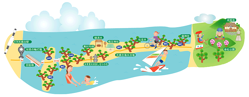 智慧之松的後方大片阿蘇海海灘為天橋立海水浴場,如果由此斜望沙灘與青松,景色優美,在1987年獲選為「日本白砂青松百選」。