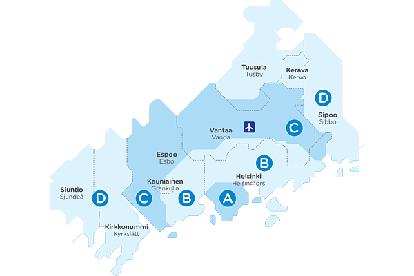 赫爾辛基在交通分區上,以赫爾辛基市為中心,往外分為A、B、C、D 等4區(如下圖),在赫爾辛基搭乘交通工具的費用,是依此4區為基準來計算,就如同台灣各城市的公車會分段收票是一樣的。
