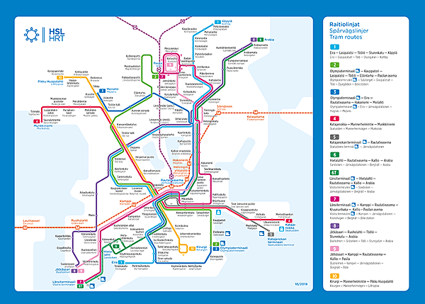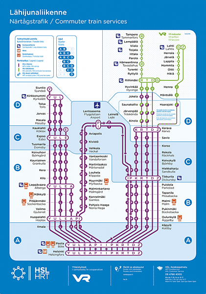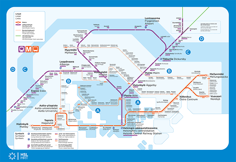 (註:HSL 為「赫爾辛基地區交通局」的芬蘭語 Helsingin Seudun Liikenne的縮寫;由於芬蘭曾被瑞典統治,所以也可見到瑞典語 Helsingfors Regionens Trafik 的縮寫HRT)