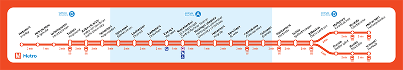 赫爾辛基地鐵只有一條單線往返,分布範圍不廣,主要分布於市中心至各重要在人口密集的社區或景點,最常會使用到的地鐵站為。由於地鐵單一直線,只有在Itäkeskus之後才會分叉成兩條小路線,搭車時只要注意搭車方向,通常不容易搭錯車,在旅遊時通常也不會搭乘至這兩條分叉路線上,所以並不需要擔心。