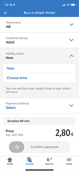 一般售票機的使用方式方非常簡便,在售票機螢幕上選擇英文(ENG),選擇單程票 (Single Ticket)或日票 (Day Tickets),然後選擇哪中區間的票(AB區),就可以投幣購票了。2018年開始,HSL重新改進售票機功能,目前詮釋這種新型藍色售票機的使用較前一代更方便使用。