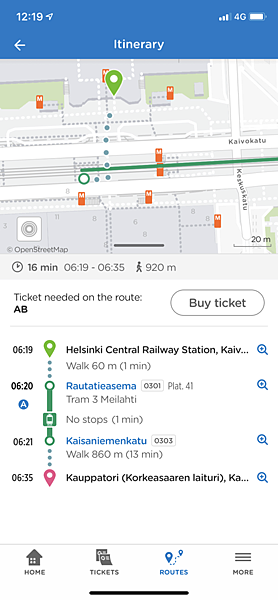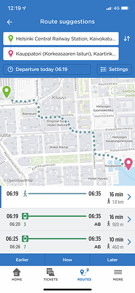 由下方4大功能中選擇「路線(ROUTES)」,進入後會要求輸入起點及終點地名,用英文輸入,不必很完整,如:中央車站到「碼頭市集廣場」,輸入起點" HELSINKI Centr.....",自動出現" HELSINKI Central Raiway Station",輸入"KAU...",自動出現"Kauppatori"。