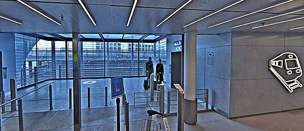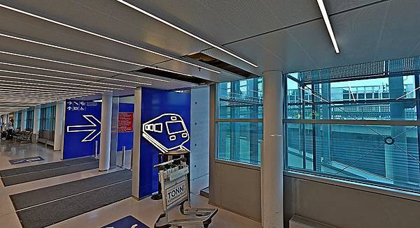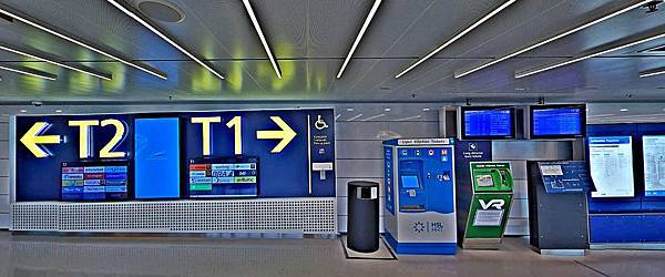 出入境出口後,前方有往第二航廈(T2)的指標,依著指標往前右轉前行,沿著右邊為各家租車公司櫃檯的走道前行約3-5分鐘,便可見到通勤列車的入口,入口處有一個大大的火車標誌,入口處前方有售票機,可在此購買車票。