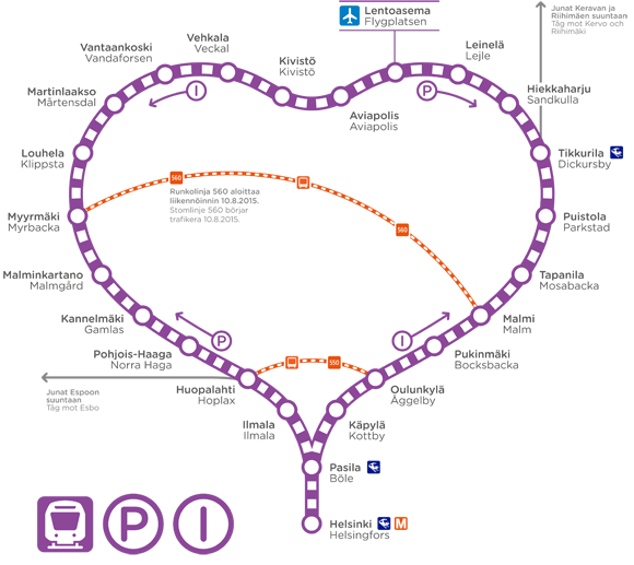 其他以Y、U、L、E、A與K、R、T、D、Z 分為2組路線,延伸至赫爾辛基周邊各城市,最遠的R線可以到達芬蘭第二大城坦佩雷(Tampere),形成赫爾辛基重要的上下班通勤路網。