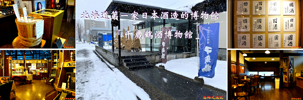 那天札幌大雪,先到創成川邊的「二條市場」吃碗海鮮丼當早餐,然後由「二條市場」沿著南二條通直行,頂著大雪、踏著5公分厚的雪路,500公尺後,至南二條通5丁目的十字路口,望見對面「興正寺別院」時右轉,便見到大雪中一座新穎的建築物前插著千歲鶴的旗幟,這便是「千歲鶴酒博物館」。