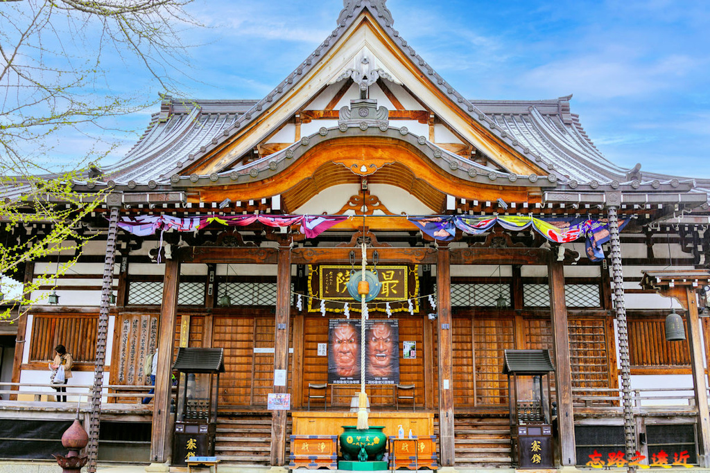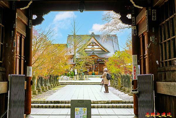 步上落櫻繽紛的參道,圍牆邊一字排開的「三十三觀音像」,以佛家觀世音普門品中所述,觀世音菩薩以三十三種變化示現,解救眾生之苦。