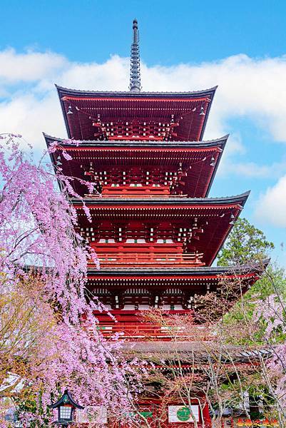春季前來,由參道入口望去,參道兩旁成排吉野櫻花盛開,參道底端越過圍牆,紅色五重塔在櫻花樹下,景色極美。