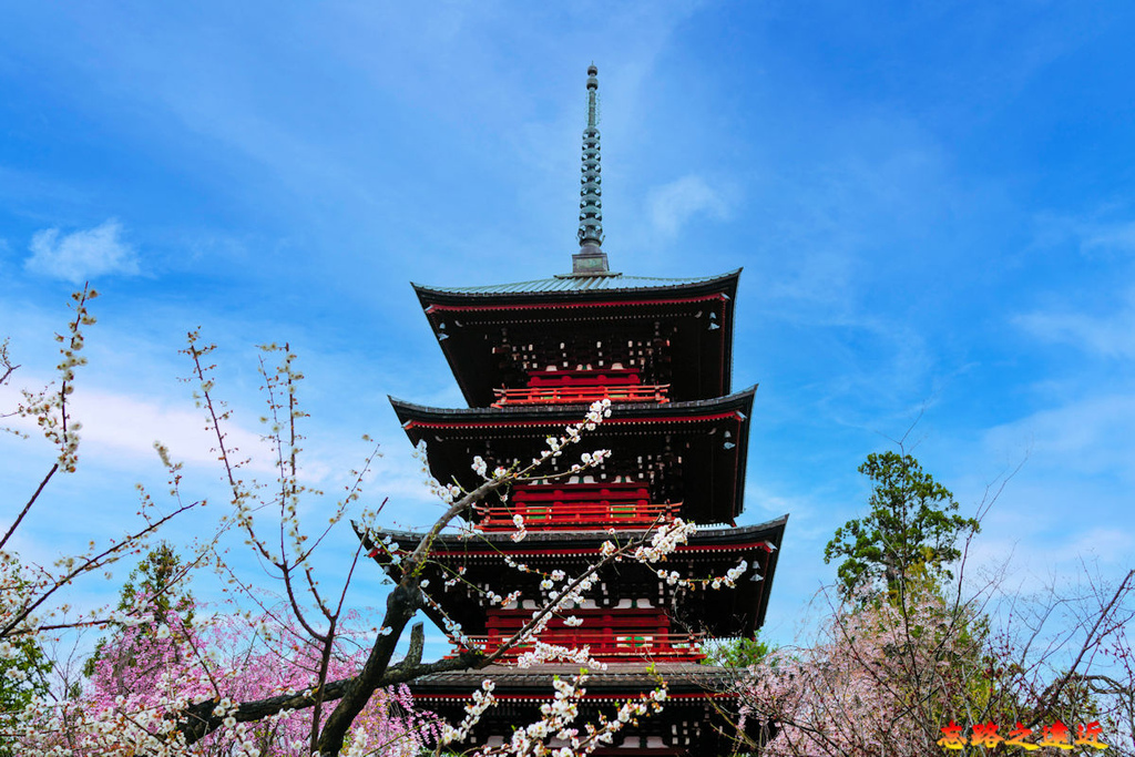 沿著三十三觀音像走進仁王門,左前方聳立的「五重塔」壯觀耀眼;五重塔寶塔造型,高度約31.2公尺 (日本度量:17間1尺3吋3分),每一層塔間高度為前一層的高度減去一半(半分)的高度遞減,因此往上望去,視野和諧;在粉櫻前任一角度欣賞都美。