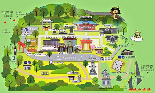 路線:地鐵 國際中心>>大守門脇櫓>>本丸北壁高石垣>>本丸詰門遺跡,護國神社鳥居>>仙台城見聞館 >>大廣間遺跡>> 伊達政宗騎馬像>>3. 昭忠之碑>> 仙台城宮城縣護國神社 >> 青葉城資料館及售店