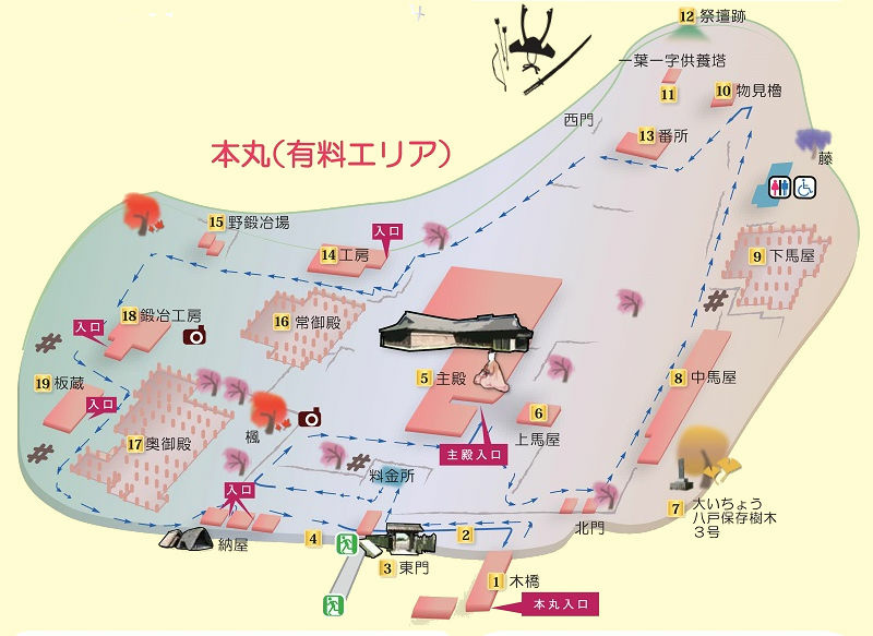 路線: 八戶市立博物館 >>八戶城東門入口>>藥草園>>木橋>>本丸>>主殿>>左側遺跡 (馬屋、物見櫓) >>右側遺跡 (工房、鍛冶場、馬廄、番所、門、柵欄、井戶)
