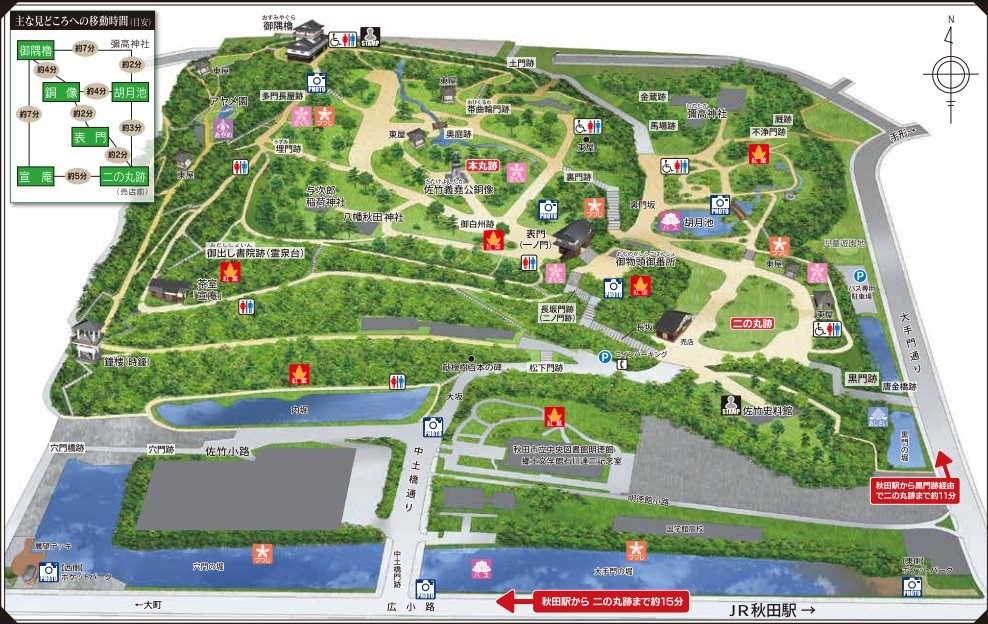 1. 秋田站步行至久保田城 1公里,步行10-15分即達。(由大手門通前往較近);15:30出發,15:45到達黑門跡