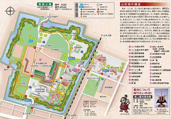 路線:山形站>>南門 (二之丸追守門)>>本丸一文字門>>本丸御殿跡>>山形鄉土館>>最上義光騎馬像>>二之丸東大門>>最上義光歷史館>>山形站