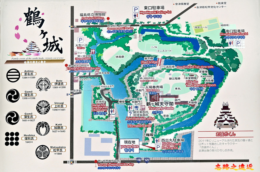 1. 在會津若松站前搭乘「まちなか周遊バス」的 「ハイカラさん」號,20分鐘後在「鶴ヶ城入口」下車,由「西出丸」入口進城 (8:30-8:50)。