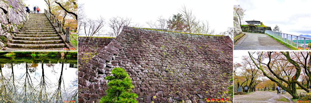 三、觀覽點:1. 清水門跡 (石垣上同心圓的石積)、2. 本丸跡、3. 前御門、4. 三重櫓 (進入參觀)、5. 小峰城歷史館 (進入參觀)