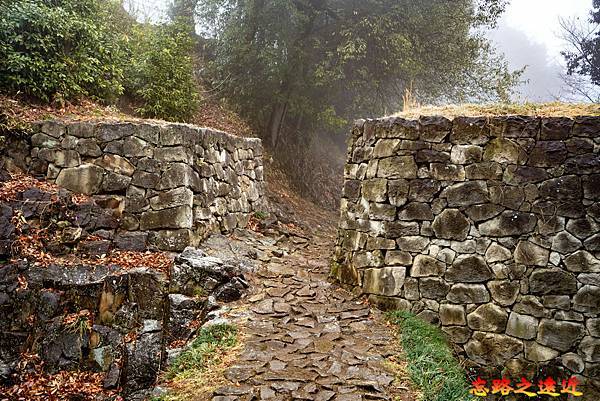 ↑ 中央石舖道路一邊土塁石垣,另一邊護城堀切