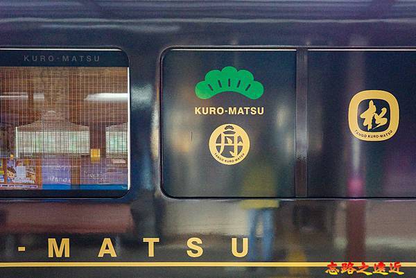 黑車的車頭前標著「松」字輩的觀光列車;車身上丹鐵獨有的燙金「丹」字與「松」字並列,上方閃亮的「Kuro-Matsu」與唯一非黑色與金色的綠色松林Logo,增添幾分奢華感。