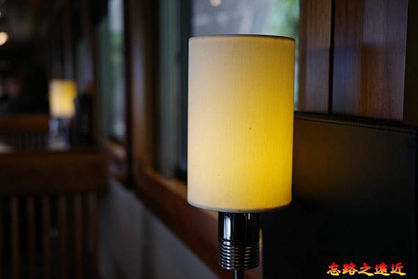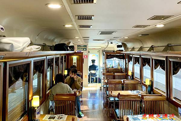 坐在座位沿著車窗往前望,成排的木桌,桌上的小檯燈,昏黃的燈光,或許不是用以增加車廂亮度,純粹用以裝飾,而裝飾效果極佳。