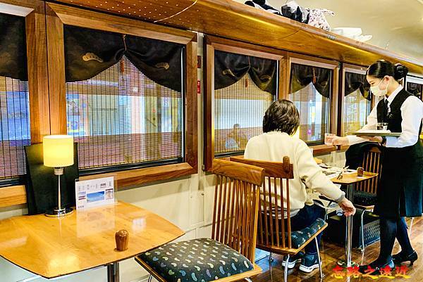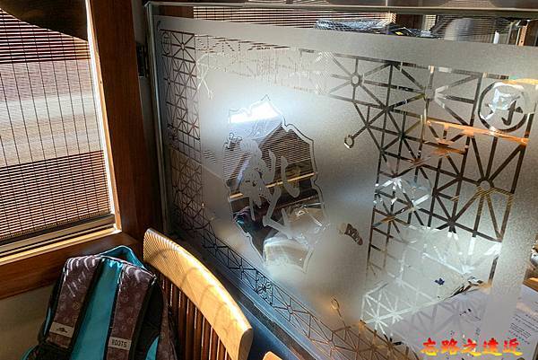 側邊木板壁上列印著整片的平淡的觀光列車Logo,壁上掛上亮麗的和風畫作,跳脫出滿滿日式氛圍。