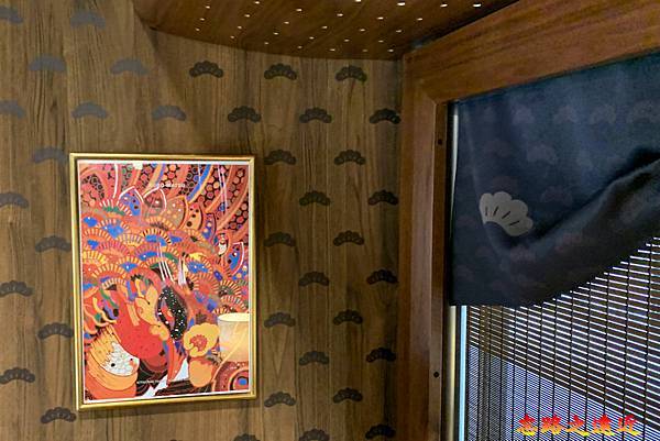 ↑ 木板壁上的「松」字觀光列車Logo,掛上亮麗的和風畫作,充滿日式氛圍