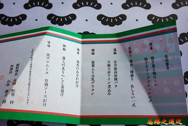 黑松號啟動後,服務人員便開始在每一張桌上放上今天午餐的菜單,7道標準的懷石料理,大部分都是丹後地區當地的食材,令人有高度的期待。更令人好奇的是,在沒有廚房的列車中,如何端出熱騰騰又美味的和食料理。