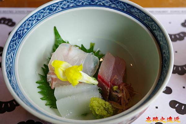 第二道的生魚片(お造り),缽碗中鮮魚三種,每一口都新鮮,彷若剛從日本海釣上來的鮮嫩,保鮮功力不禁令人佩服。