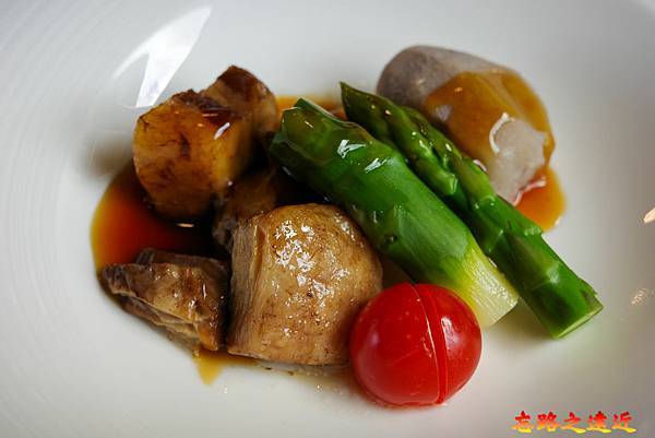 第三道稱為「溫物」,日本和食料理中的溫物通常指的是蔬菜燉或蒸煮的溫熱菜餚;今天的溫物以天橋立紅酒燉丹波高原三層肉,完全是道地在地食材,配上粗壯的蘆筍、鬆軟的芋頭,嫩脆兼顧,好吃!