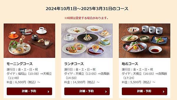 「黑松號」為旅行餐車的的設計,運行日為周五、六、日及國定假日。早上10點福知山出發至天橋立的早餐列車 (Morning Course)、下午1點天橋立出發至西舞鶴的午餐列車 (Lunch Course),以及下午4點天橋立出發至西舞鶴的在地美食行程列車 (Sweet Course),一路欣賞鐵道風光,一路品嘗美食,相當愜意。本文介紹的是午餐列車 (Lunch Course),供想品味星級廚師操刀設計的奢華美食,有可欣賞大江山國定公園美景的觀光列車的親朋好友參考。